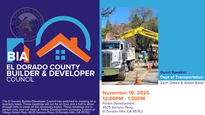 The El Dorado Builder/Developer Council has switched to meeting on a quarterly basis. These meetings will run for an hour and a half to allow enough time to cover all the necessary topics. These meetings are in person only, and will meet at Parker Development Company located at Village Green Park, 4525 Serrano Pkwy, El Dorado Hills, CA 95762